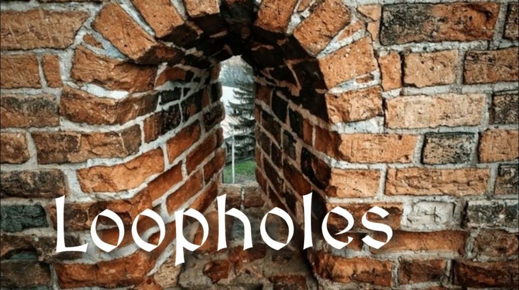 The term “loophole” originated in the mid-15th century from medieval forts and castles. A loophole was a narrow, vertical slits in the wall through which archers could shoot at attackers and yet remain safe from returned arrows. The word came from Middle English loupe, a slit.